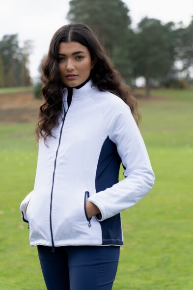 Full Zip Jacket: This jacket combines soft-touch double knit comfort with body-shaping seams to create a flattering, modern silhouette. It features on-seam zip pockets and rib cuffs with thumbholes to move effortlessly with your swing.
